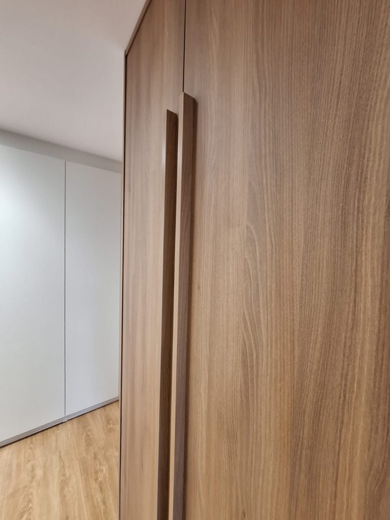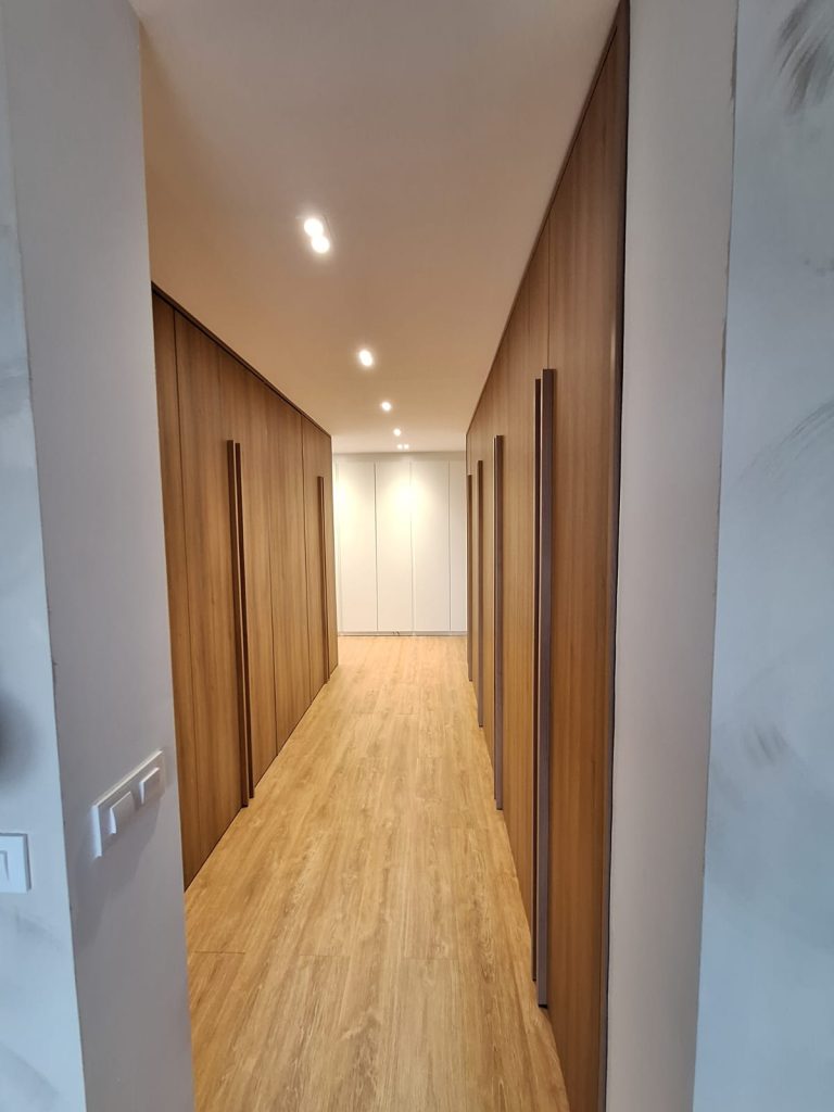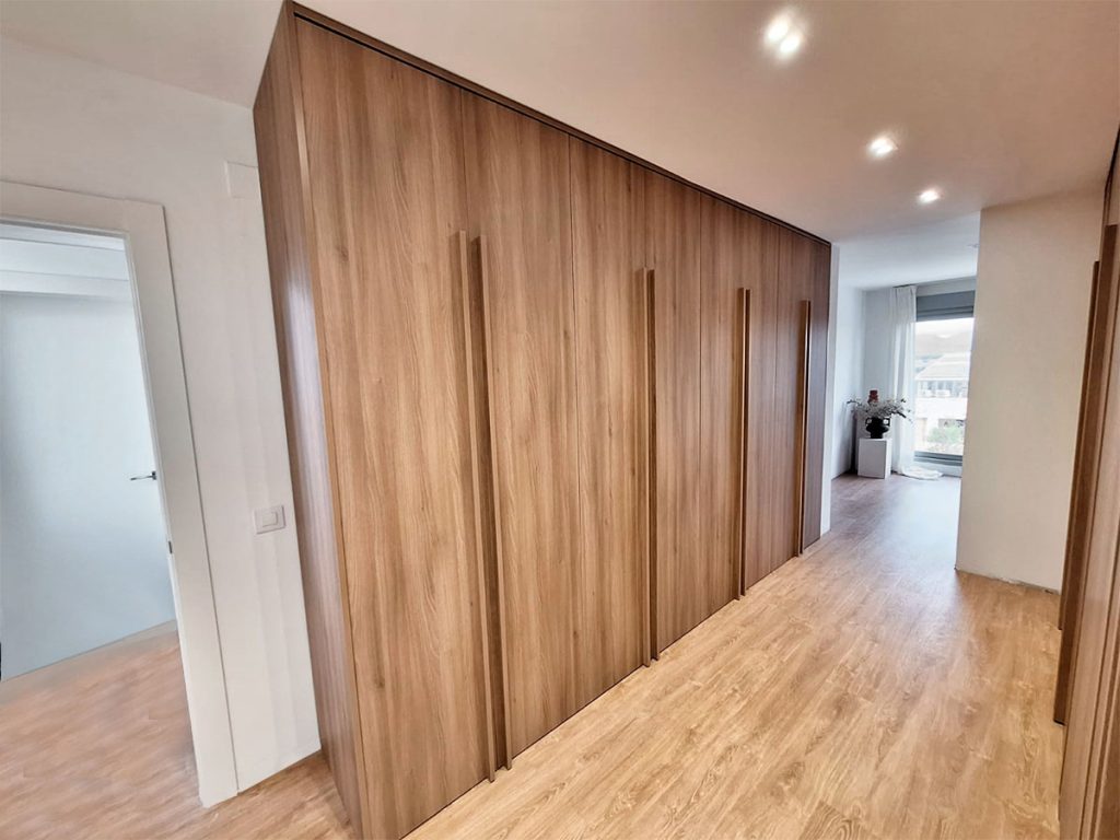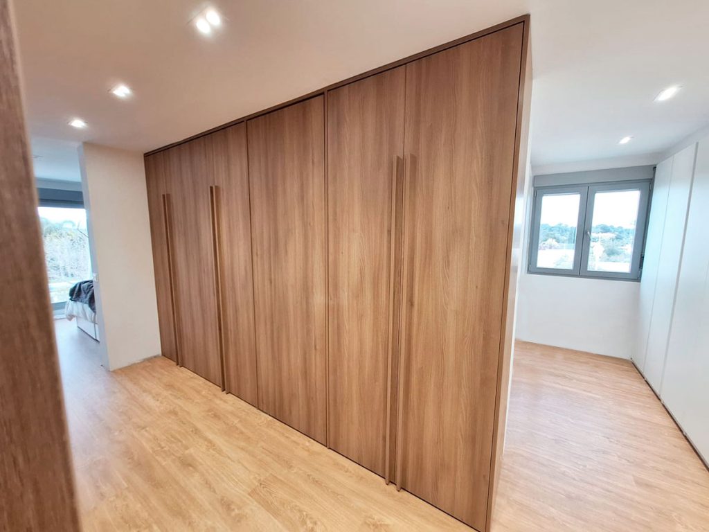 Este vestidor, se divide en dos lineales de armarios, en uno de ellos, a través de una puerta pivotante se accede al baño. Quedando totalmente integrado con el armario.
